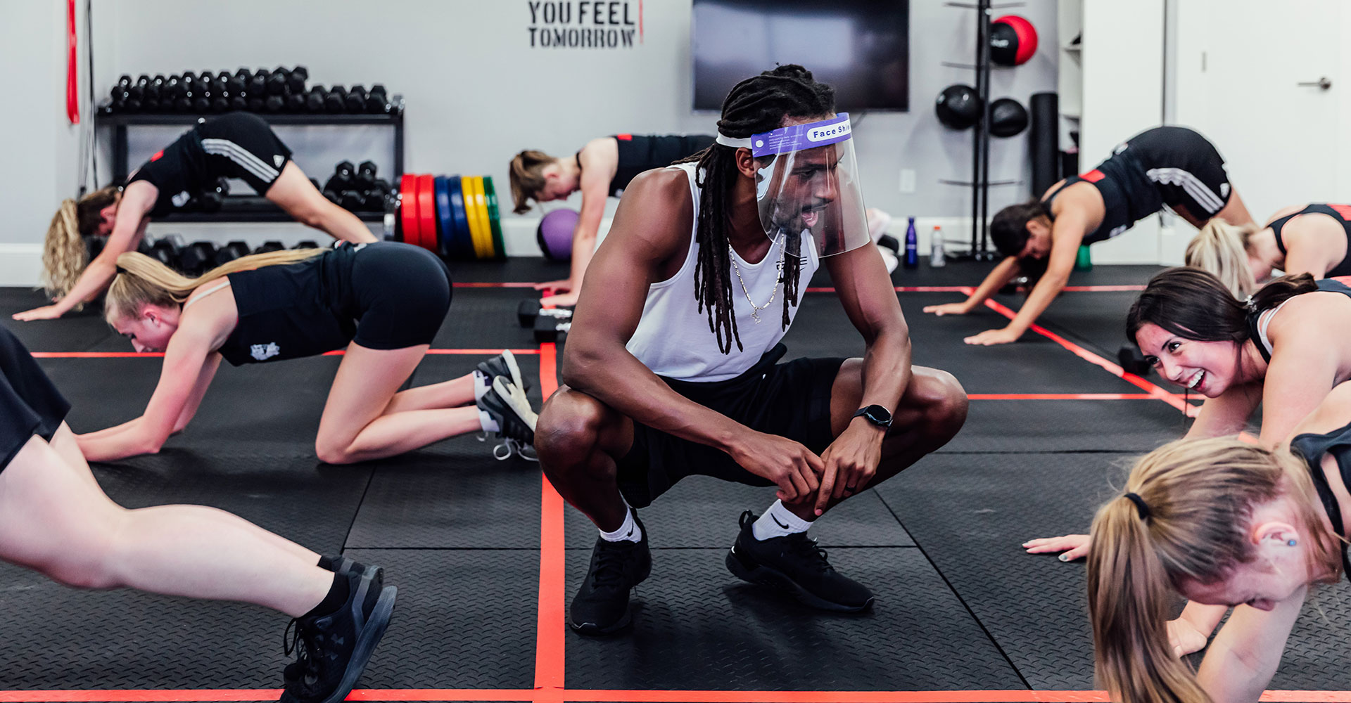 No commute required. Train from anywhere with a device and a connection. Workouts are adapted to whatever equipment you have — bodyweight, dumbbells, bands. You’ll still leave drenched.